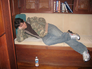 No, we’re not smuggling hot captains across Galveston Bay. Today I walked up into the cockpit to find Matt down in the port side lazarette changing the zincs in the engine (prevents the sea water from corroding the cooling system). Just when I’m convinced he’s contorted himself into every nook & cranny of our boat, he always seems to find new places to explore. I love this face!